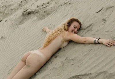 At the beginning of this gallery, Zach Venice captures Sonya Buse lying topless in the tall green grass. However, the gallery then transitions to the beach, where Sonya strips off her red shorts as well, and while fully nude, she flaunts her figure in the sand.